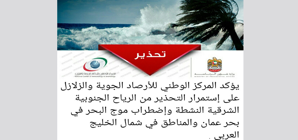 أكد المركز الوطني للارصاد الجوية والزلازل، استمرار التحذير من الرياح الجنوبية الشرقية النشطة واضطراب موج البحر في بحر عمان والمناطق في شمال الخليج العربي.
