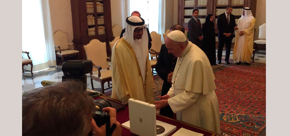 وكان قداسة بابا الكنيسة الكاثوليكية استقبل صاحب السمو الشيخ محمد بن زايد آل نهيان ولي عهد أبوظبي نائب القائد الأعلى للقوات المسلحة والوفد المرافق بمقر البابوية في مدينة الفاتيكان حيث جرت لسموه مراسم استقبال رسمية.. فيما بحث الجانبان تعزيز العلاقات الثنائية وسبل تطويرها بما يخدم القضايا الإنسانية ويعزز قيم السلام والتعايش بين مختلف شعوب ومناطق العالم.