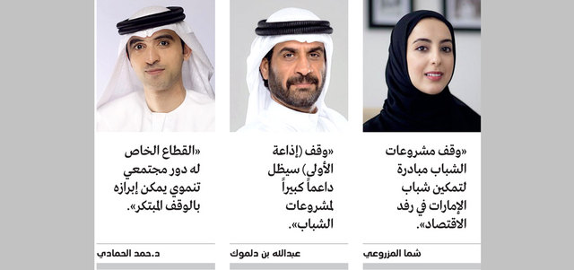 وقال الرئيس التنفيذي لمركز حمدان بن محمد لإحياء التراث، عبدالله حمدان بن دلموك: «نحن سعداء بالمشاركة في الرؤية العالمية للوقف، التي أطلقها صاحب السمو الشيخ محمد بن راشد آل مكتوم، نائب رئيس الدولة رئيس مجلس الوزراء حاكم دبي، لإعادة إحياء الوقف كأداة تنموية للمجتمع، وابتكرت إذاعة الأولى، التابعة للمركز، أول إعلانات إذاعية وقفية في العالم، يتم تخصيصها لدعم مشروعات شباب الإمارات، الذي سيظل داعماً كبيراً لمشروعات الشباب، ويشكل دوراً مجتمعياً للإذاعة».