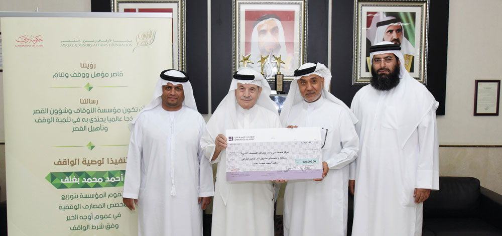 سلّمت مؤسسة الأوقاف وشؤون القصّر في دبي، شيكاً بـ 625 ألف درهم إلى مركز محمد بن راشد لطباعة المصحف الشريف، من وقف المرحوم أحمد محمد بغلف، وذلك لخدمة كتاب الله ونشره، من خلال طباعة 70 ألف مصحف، سيتم توزيعها على المسلمين في مختلف أنحاء العالم.