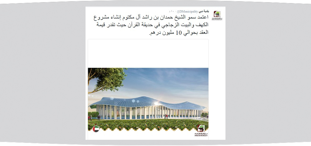 اعتمد سمو الشيخ حمدان بن راشد آل مكتوم نائب حاكم دبي وزير المالية رئيس بلدية دبي إنشاء مشروع الكهف والبيت الزجاجي المقام بحديقة القرآن الكريم والذي تقدر تكلفته الإجمالية بحوالي 10 ملايين درهم.