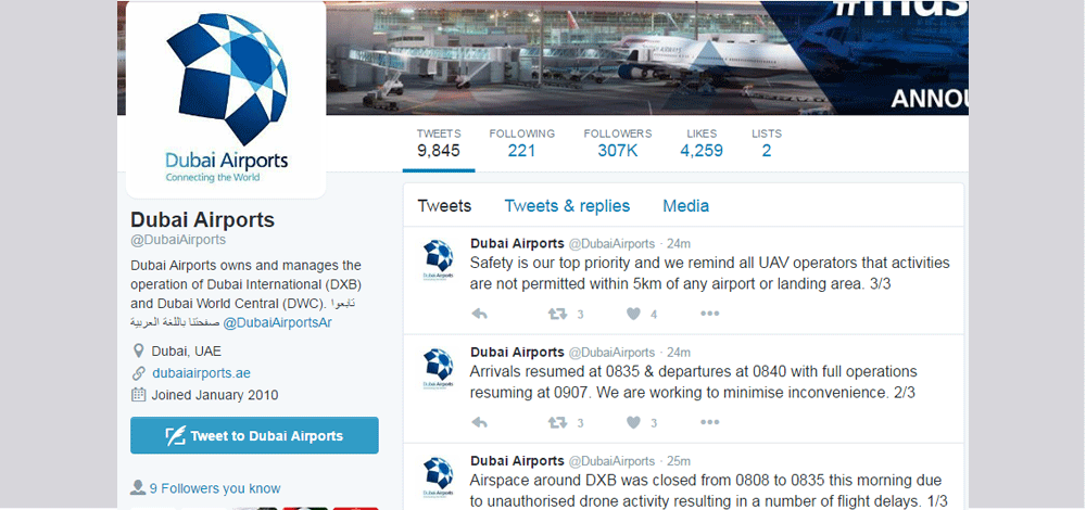 وأكدت ادارة المطارات أن وجود الطائرات بدون طيار غير المرخصة في المجال الجوي حول مطار دبي، تسبب أيضا بتأجيل عدد من الرحلات لبعض الوقت، مشددة في الوقت نفسه على أولوية سلامة المسافرين.