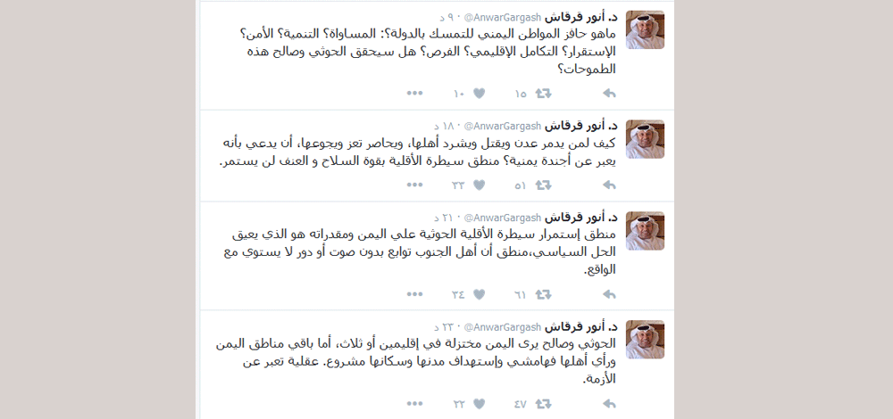 قال وزير الدولة للشؤون الخارجية الدكتور أنور قرقاش في تغريدة له عبر حسابه في موقع التواصل الاجتماعي "تويتر": "الحوثي وصالح يرى اليمن مختزلة في إقليمين أو ثلاث، أما باقي مناطق اليمن ورأي أهلها فهامشي وإستهداف مدنها وسكانها مشروع، عقلية تعبر عن الأزمة.