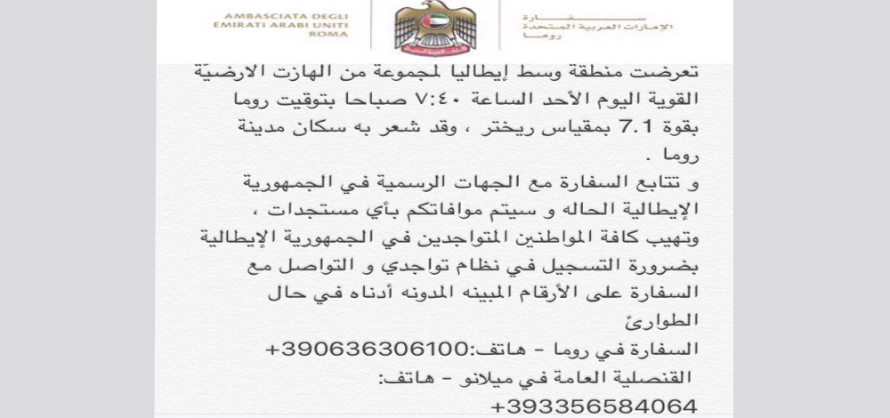 "تعرضت منطقة وسط إيطاليا لمجموعة من الهزات الأرضية اليوم، بلغت قوته7.1 درجة على مقياس ريختر، وقد شعر به سكان مدينة روما، وتتابع السفارة مع الجهات الرسمية في الجمهورية الإيطالية الحالة.