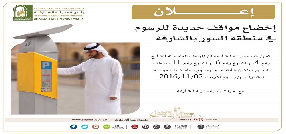 اعلنت بلدية مدينة الشارقة أن المواقف العامة في الشارع رقم 4، والشارع رقم 6، والشارع رقم 11، بمنطقة السور ستكون خاضعة لرسوم المواقف المدفوعة اعتباراً من يوم الاربعاء 2/11/2016.
