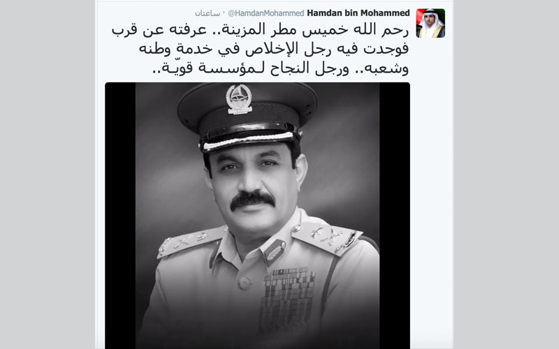 نعى سمو الشيخ حمدان بن محمد بن راشد آل مكتوم، ولي عهد دبي، في تغريدات له على موقع التواصل الاجتماعي "تويتر"، الفريق خميس مطر المزينة قائد عام شرطة دبي الذي توفي أمس إثر أزمة قلبية.