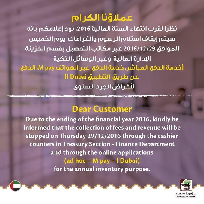 تشرت بلدية دبي تغريدة على موقع التواصل الاجتماعي "نويتر" اعلنت فيها عن إيقاف استلام الرسوم والغرامات اليوم، عبر مكاتب التحصيل بقسم الخزينة - الإدارة المالية وعبر الوسائل الذكية، بسبب قرب انتهاء السنة المالية.