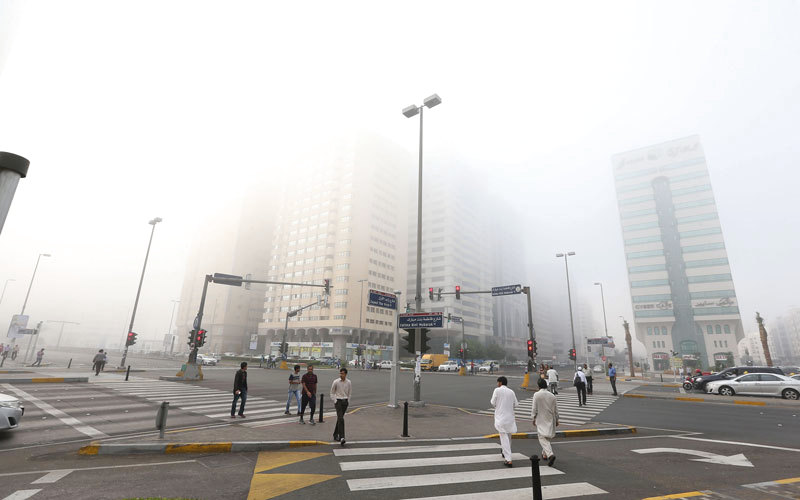 وأضاف أن «الضباب سيكون كثيفاً والرؤية متدنية على شارع الشيخ زايد، وشارع الشيخ محمد بن زايد والطرق القريبة منهما بصورة ملحوظة، إضافة إلى المناطق القريبة من البحر، في حين أن المناطق المكتظة بالبنايات ذات الكثافة السكانية العالية ستقل فيها كثافة الضباب بعض الشيء نتيجة تكسير غاز ثاني أكسيد الكربون للضباب».