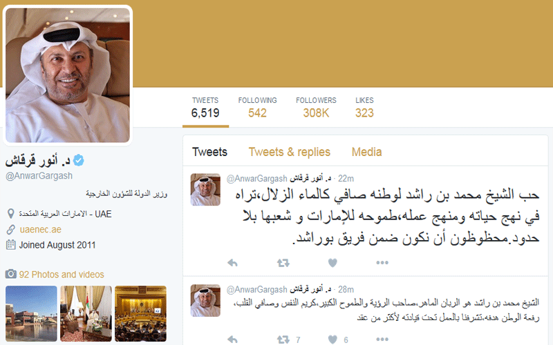 قال وزير الدولة للشؤون الخارجية، الدكتور أنور محمد قرقاش في مجموعة تغريدات على حسابه الرسمي في "تويتر": "حب الشيخ محمد بن راشد لوطنه صافي كالماء الزلال،تراه في نهج حياته ومنهج عمله،طموحه للإمارات و شعبها بلا حدود.محظوظون أن نكون ضمن فريق بوراشد.
