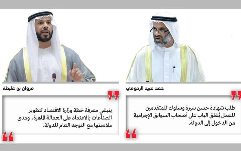 يوجه أعضاء في المجلس، خلال الجلسة، سؤالين إلى وزير الموارد البشرية والتوطين، صقر غباش، حيث يوجه العضو حمد أحمد الرحومي سؤالاً حول «شهادة حسن السيرة والسلوك للمتقدمين للعمل في الدولة».