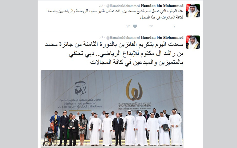 قال سمو الشيخ حمدان بن محمد بن راشد آل مكتوم ولي عهد دبي عبر حساب سموه على موقع التواصل الإجتماعي" تويتر"، سعدت اليوم بتكريم الفائزين بالدورة الثامنة من جائزة محمد بن راشد آل مكتوم للإبداع الرياضي.. دبي تحتفي بالمتميزين والمبدعين في كافة المجالات.