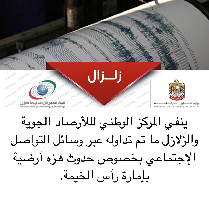 نفي المركز الوطني للأرصاد الجوية والزلازل، ماتم تدوله عبر وسائل التواصل الاجتماعي، بخصوص حدوث هزة ارضية باماراة راس الخيمة .
