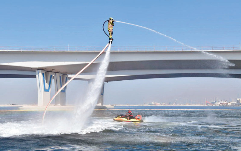 وقال المطروشي، لـ«الإمارات اليوم»، إنه تم تدريب عدد من رجال الدفاع المدني على التقنية الجديدة، التي تعتمد على نظام المحركات النفاثة، يستطيع من خلالها الإطفائي التحليق جواً، وإطفاء الحرائق البحرية والبرية القريبة من المرفأ، سواء كانت في زوارق أو مركبات.