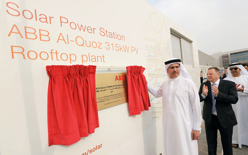 دشّن العضو المنتدب الرئيس التنفيذي لهيئة كهرباء ومياه دبي، سعيد محمد الطاير، محطة تعمل بالألواح الكهروضوئية لإنتاج الكهرباء من الطاقة الشمسية بقدرة 315 كيلوواط على سطح منشأة مجموعة «إيه بي بي» السويسرية في منطقة القوز الصناعية في دبي، وتعتبر أحد أكبر أنظمة الطاقة الشمسية في المنطقة.