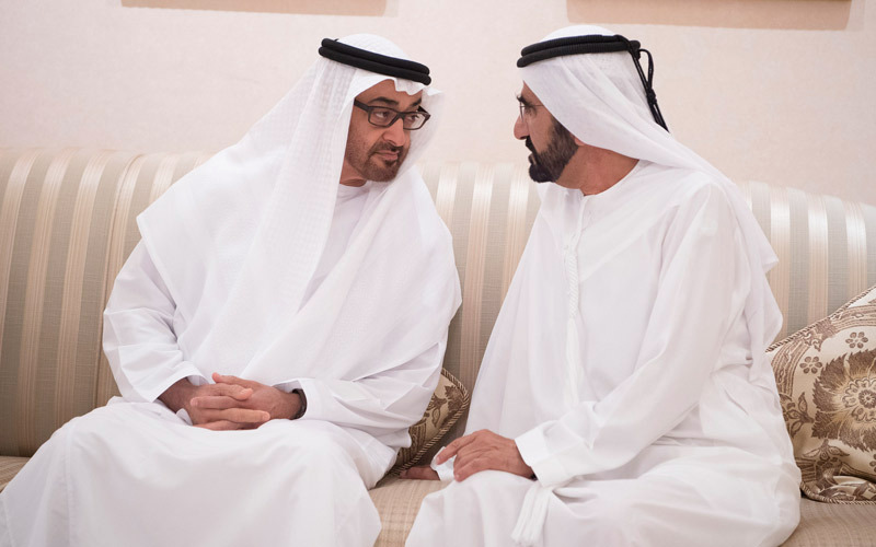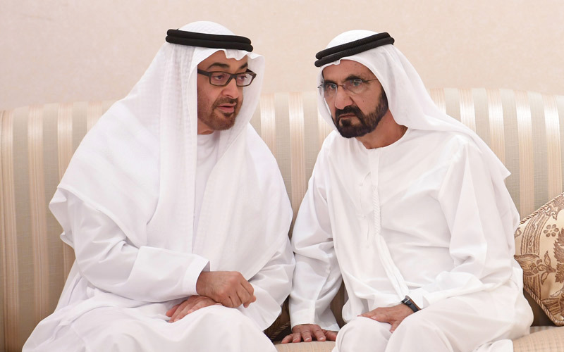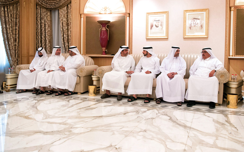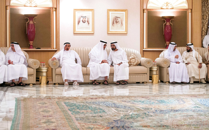 محمد بن راشد يتقبل التعازي من محمد بن زايد والنعيمي والشرقي في وفاة شيخة بنت سعيد آل مكتوم