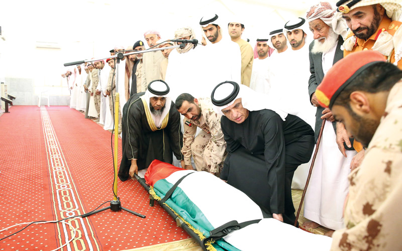 وكان جثمان الشهيد البطل، الوكيل راشد علي محمد الظهوري، وصل إلى مطار البطين الخاص في أبوظبي، أمس، على متن طائرة عسكرية تابعة للقوات الجوية والدفاع الجوي. وقد جرت على أرض المطار المراسم العسكرية الخاصة باستقبال جثمان الشهيد، حيث كان في الاستقبال عدد من كبار ضباط القوات المسلحة.