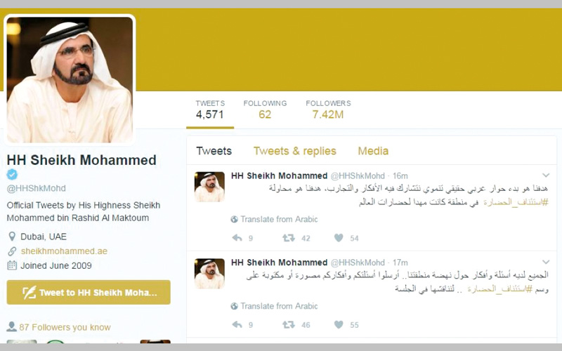 لاقت التغريدة، التي نشرها صاحب السمو الشيخ محمد بن راشد آل مكتوم، نائب رئيس الدولة رئيس مجلس الوزراء حاكم دبي، أمس، عبر حسابه الشخصي على موقع التواصل الاجتماعي «تويتر»، التي دعا من خلالها إلى المشاركة في طرح أسئلة حول نهضة المنطقة، ضمن وسم «#استئناف_الحضارة» ليناقشها في جلسة حوارية له الأسبوع المقبل في القمة العالمية للحكومات حول «استئناف الحضارة في العالم العربي.. والعودة لطريق التنمية»، تفاعلاً واسعاً من ناشطين خليجيين وعرب.