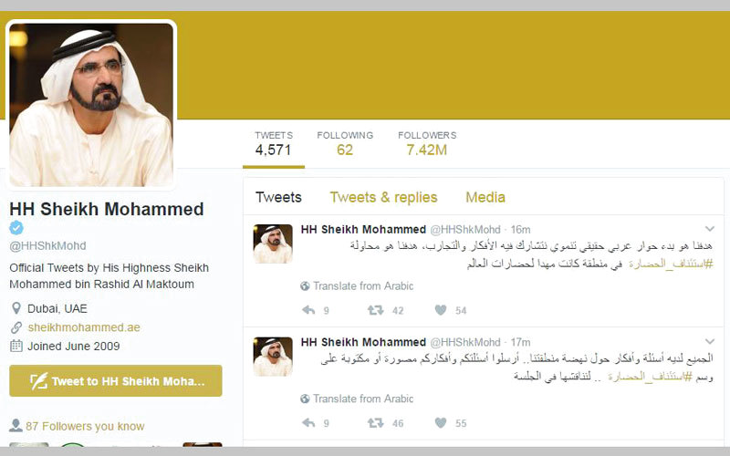 واصل مغردون، لليوم الثالث على التوالي، تفاعلهم على «تويتر» مع وسم «#استئناف_الحضارة»، الذي أطلقه صاحب السمو الشيخ محمد بن راشد آل مكتوم، نائب رئيس الدولة رئيس مجلس الوزراء حاكم دبي، ودعا من خلاله إلى المشاركة في طرح أسئلة حول نهضة المنطقة، ضمن وسم ليناقشها في جلسة حوارية له الأسبوع المقبل في القمة العالمية للحكومات حول «استئناف الحضارة في العالم العربي.. والعودة لطريق التنمية»، تفاعلاً واسعاً من ناشطين خليجيين وعرب.