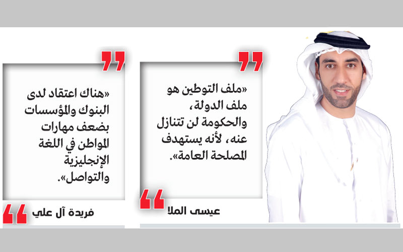 واعتبر رئيس الكوادر الوطنية، في برنامج الإمارات لتطوير الكوادر الوطنية «كوادر»، عيسى الملا، أن «الأرقام تشير إلى ضرورة تفعيل الدور الحكومي الرقابي بصورة أكثر من أي وقت مضى، لدراسة الحالة الراهنة، ومعرفة أسبابها، فالبنوك التي غالباً ما تحقق أرباحا سنوياً، وأعلن بعضها عن تحقيق طفرات في الأرباح، العام الماضي تحديداً، يجب ألا تتحفظ في توظيف مواطنين».