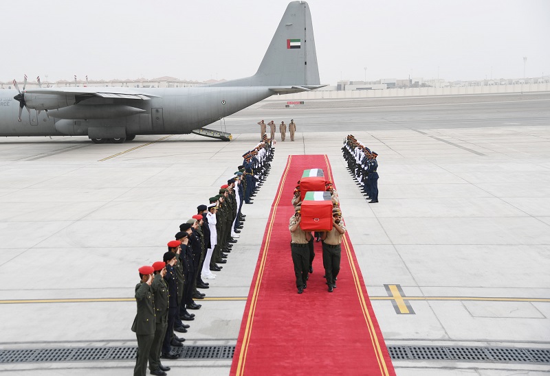 وصل الى مطار البطين الخاص بأبوظبي اليوم جثماني الشهيدين الرقيب نادر مبارك عيسى سليمان والجندي أول سليمان محمد سليمان الظهوري من شهداء الوطن الأبطال على متن طائرة عسكرية تابعة للقوات الجوية والدفاع الجوي.