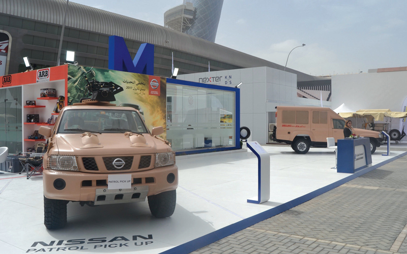 شهد معرض ومؤتمر الدفاع الدولي عرضاً متخصصاً حول كيفية تعديل وإضافة مواصفات لسيارات نيسان، تعزز من قدراتها على إتمام مهمات خاصة، وكذلك مهمات قتالية لتلبية المتطلبات العسكرية.وعرضت شركة المسعود للسيارات، سيارة «نيسان باترول بيك أب»، تم تحويلها إلى سيارة إسعاف عسكرية، مع قاعدة عجلات أطول، وهيكل تم صنعه خصيصاً لضمان أن الطاقم الطبي لديه المساحة المطلوبة للقيام بالمساعدات الطبية داخل الموقع، إضافة إلى نقل المصابين من المناطق الوعرة إلى أقرب مستشفى. وعرضت أيضاً سيارة «نيسان باترول بيك أب» مع منصة حاملة للأسلحة الثقيلة، وتشمل منطقة مسطحة مع نقاط متعددة تسمح للجنود بسهولة الدخول والخروج من المركبة. وكذلك سيارة «نيسان نافارا بيك أب»، تم تعديلها لتصبح ناقلة للأفراد مجهزة بتعليق وإطارات والعديد من الإضافات الأخرى للقيادة على الطرقات الوعرة.