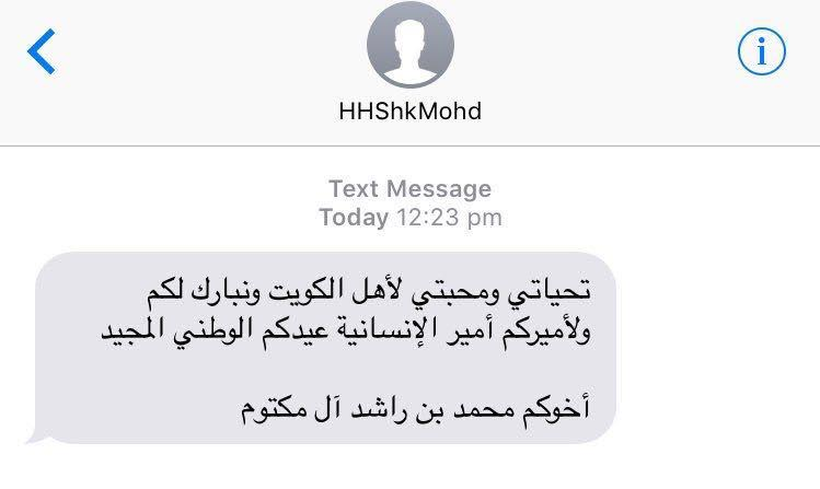 أرسل صاحب السمو الشيخ محمد بن راشد آل مكتوم نائب رئيس الدولة رئيس مجلس الوزراء حاكم دبي، رسالة نصية لأهل الكويت و شعبها يبارك لهم و لأميرهم أمير الانسانية باليوم الوطني.