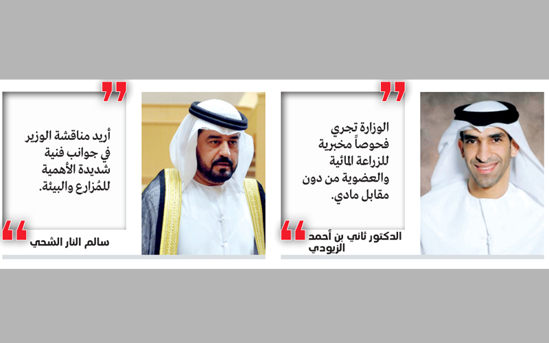 وقال الشحي: «بجانب الدعم المقدم للمزارعين، هناك المزيد من الأمور الفنية التي يريد المزارع الاستفسار عنها من الوزير الذي يحظى بثقة وحب كل العاملين في المجال الزراعي بالدولة»، مؤكداً أنه لم يوافق على الرد الكتابي الذي أرسله الوزير على سؤاله «لأنه يريد مناقشته في جوانب فنية شديدة الأهمية للمُزارع والبيئة».