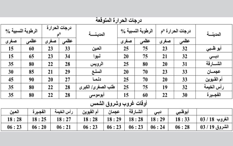 حالة الطقس ودرجات الحرارة المتوقعة في الدولة خلال اليومين القادمين