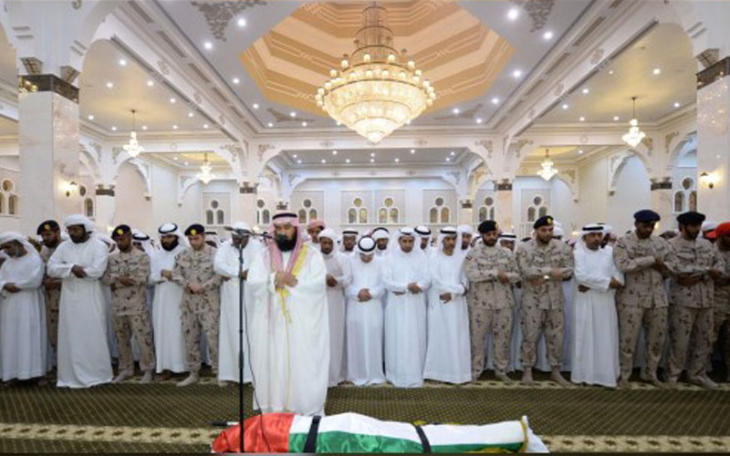 أدى الشيخ سعيد بن صقر القاسمي مدير الديوان الاميري بخورفكان والشيخ هيثم بن صقر القاسمي وجموع المصلين عصر اليوم في جامع سيد الشهداء في مدينة كلباء صلاة الجنازة على جثمان الشهيد زكريا الزعابي أحد جنودنا البواسل المشاركين في عملية " إعادة الأمل " مع قوات التحالف العربي الذي تقوده المملكة العربية السعودية للوقوف مع الشرعية في اليمن.