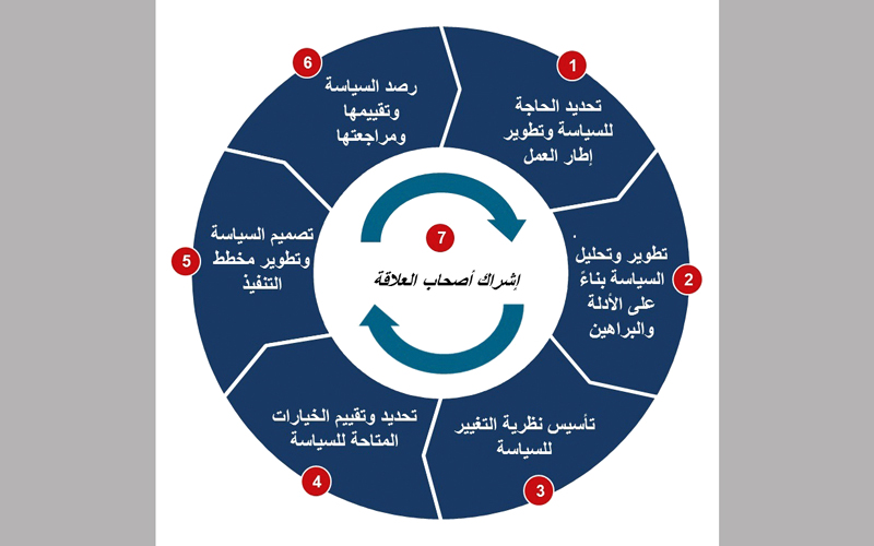 ويفصّل الدليل مراحل رسم السياسات الحكومية، من خلال منهجية التطوير، التي تتطلب اتباع سبع مراحل رئيسة تضمن صنع السياسات المثلى، التي تسعى الحكومة من خلالها لخدمة المجتمع، وتوفير سبل السعادة والعيش الكريم لأفراده، المرحلة الأولى هي تحديد الحاجة للسياسة وتطوير إطار العمل، وتهدف إلى وضع تعريف واضح مع تحديد نطاق السياسة وأهم القضايا ومسبباتها، إضافة إلى جدوى التدخل الحكومي لحل التحديات التي تم استخلاصها مسبقاً.