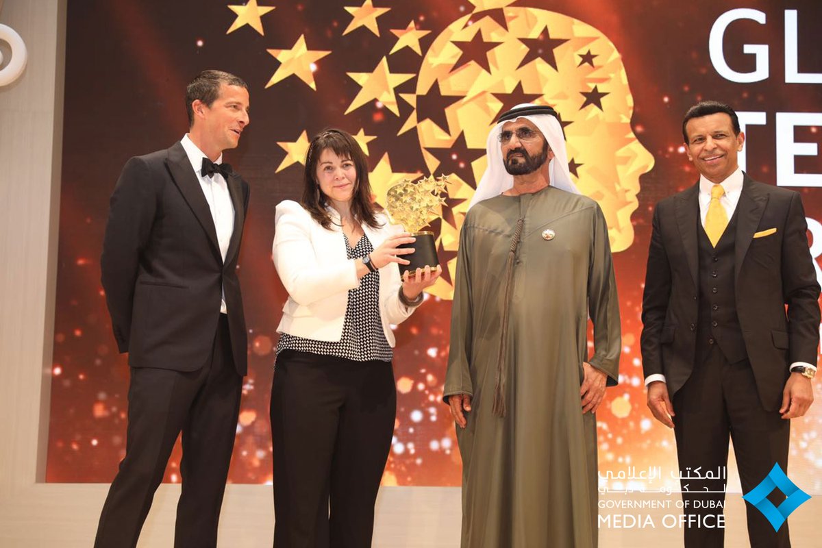 كرم صاحب السمو الشيخ محمد بن راشد آل مكتوم نائب رئيس الدولة رئيس مجلس الوزراء حاكم دبي المعلمة ماجي ماكدونال من كندا التي فازت بجائزة المعلم العالمية التي تنظمها سنويا مؤسسة فاركي في دبي وذلك خلال الحفل الذي أقيم في فندق ومنتجع اطلنطس في دبي مساء اليوم وحضره سمو الشيخ حمدان بن محمد بن راشد آل مكتوم ولي عهد دبي وسمو الشيخ أحمد بن محمد بن راشد آل مكتوم رئيس مؤسسة محمد بن راشد آل مكتوم للمعرفة و وزير شؤون مجلس الوزراء والمستقبل محمد بن عبدالله القرقاوي و شما بنت سهيل بن فارس المزروعي وزيرة دولة لشؤون الشباب الى جانب الدكتورة ايرينا بوكوفا مدير عام منظمة التربية والثقافة والعلوم "يونسكو" والسيد صني فاركي رئيس مؤسسة فاركي وعدد من القيادات التعليمية والتربوية العالمية ومن دولة الإمارات.