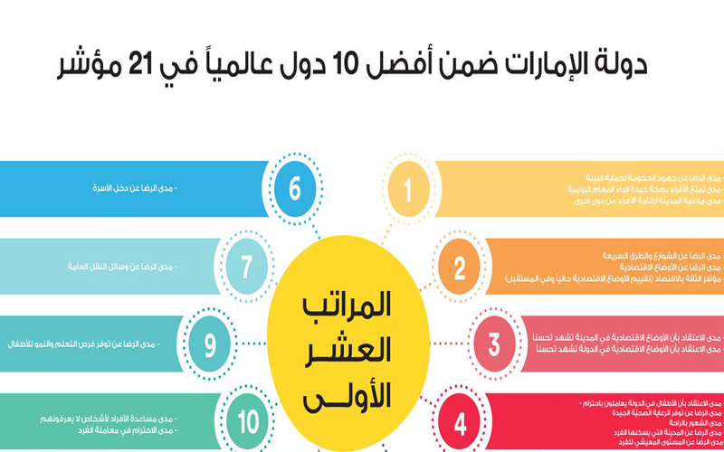 وحلت الدولة في المرتبة الأولى عربيا لثلاث سنوات متتالية .. فيما تقدمت من المركز 28 إلى المركز 21 عالميا في مؤشر سعادة الأفراد المواطنين والمقيمين على أرضها من دول أخرى لتسجل بذلك تقدما نوعيا بمقدار 7 مراكز مقارنة بتصنيفها في تقرير السعادة العالمي لعام 2016 الذي تصدرته النرويج تلتها الدنمارك وآيسلندا ثم سويسرا وفنلندا.