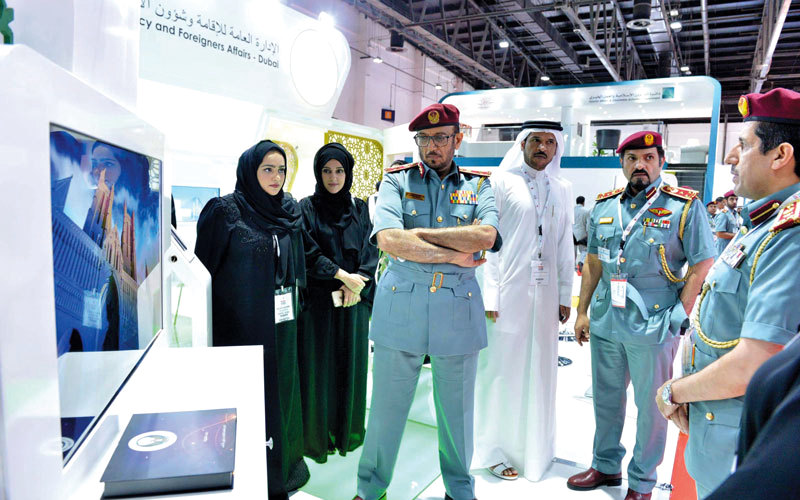 «إقامة دبي» عرضت «روبوت سعادة المتعاملين» الذي تم تصنيعه كاملاً في الإدارة. تصوير: مصطفى قاسمي