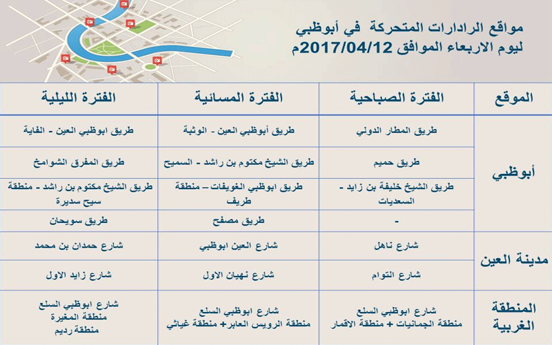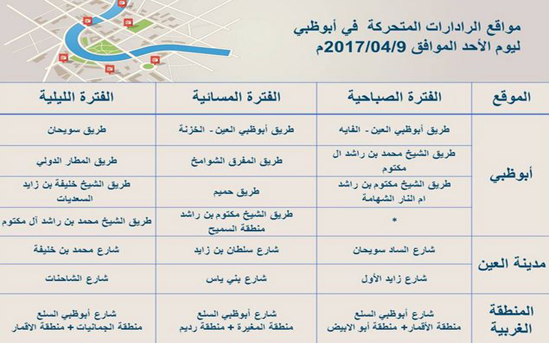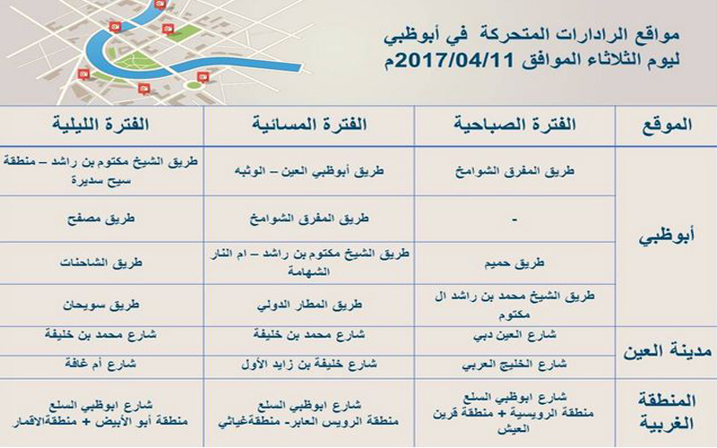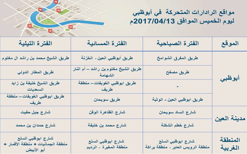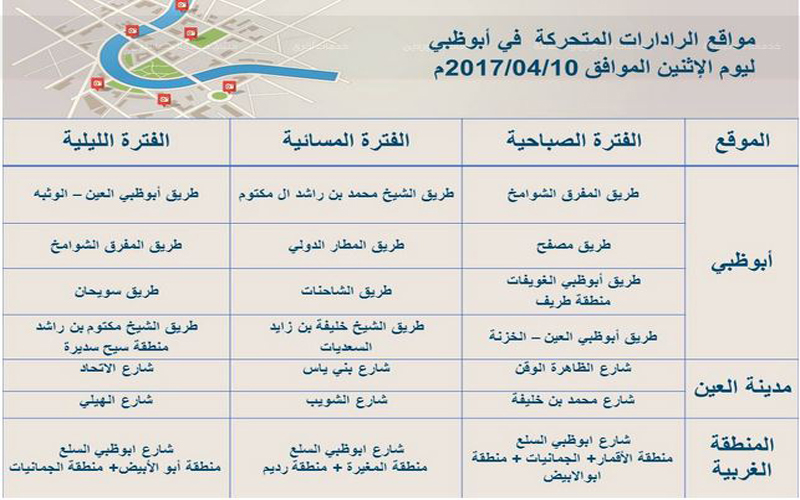 نشرت شرطة أبوظبي عبر موقعها الرسمي أماكن تواجد الرادارات المتحركة في أبوظبي هذا الأسبوع خلال الفترات الصباحية والمسائية والليلية.