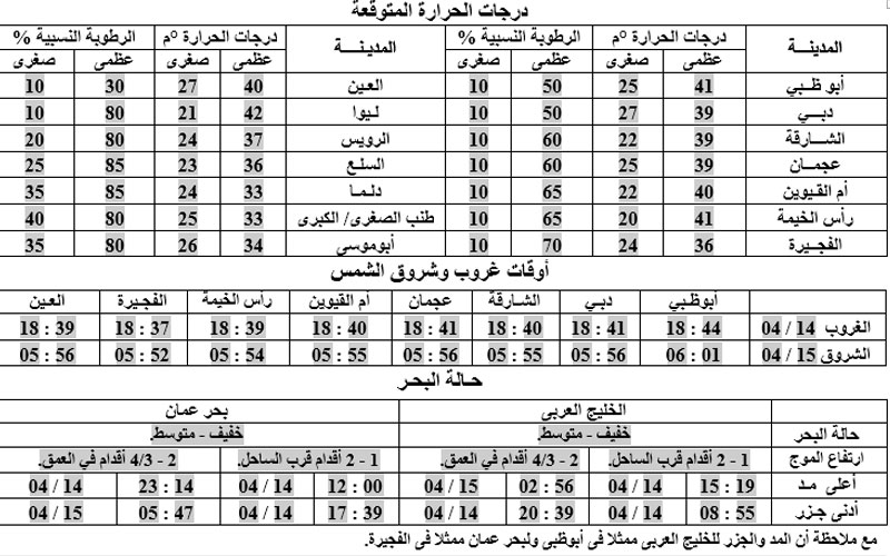 توقع المركز الوطني للأرصاد الجوية والزلازل أن يسود البلاد طقس صحو بوجه عام إلى حار نسبيا خلال النهار وغائم جزئيا أحيانا على بعض المناطق، والرياح خفيفة إلى معتدلة السرعة في البداية، تصبح شمالية غربية معتدلة إلى نشطة السرعة بعد ظهر الأحد مع انخفاض في درجات الحرارة خاصة غربا، وتزداد الرطوبة النسبية في ساعات الليل وصباح الإثنين الباكر على بعض المناطق الساحلية والداخلية، مع فرصة لتشكل الضباب أو الضباب الخفيف، والبحر خفيف إلى متوسط الموج في الخليج العربي، يصبح متوسط الموج إلى مضطرب بعد ظهر الأحد، وخفيف إلى متوسط الموج بوجه عام في بحر عمان.