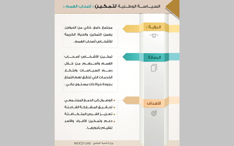 نائب رئيس الدولة: «إطلاق مسمى (أصحاب الهمم) على ذوي الإعاقة لجهودهم الجبارة في تحقيق الإنجازات والتغلب على التحديات». «ما حققه أصحاب الهمم في مختلف المجالات من إنجازات، دليل على أن العزيمة والإرادة تصنعان المستحيل». «مؤسساتنا ستبدأ اليوم بتجسيد اهتمامنا الكبير والراسخ بأصحاب الهمم». مجتمع دامج خالٍ من الحواجز تؤكد السياسة الوطنية لتمكين ذوي الإعاقة على إيجاد مجتمع دامج خالٍ من الحواجز، يضمن التمكين والحياة الكريمة للأشخاص ذوي الإعاقة وأسرهم، من خلال رسم السياسات وابتكار الخدمات التي تحقق لهم التمتع بجودة حياة ذات مستوى عالٍ والوصول إلى الدمج المجتمعي، وتحقيق المشاركة الفاعلة، وتعزيز الفرص المتكافئة، ودعم وتمكين الأفراد والأسر للقيام بأدوارهم. تأسيس مجلس استشاري لتحقيق أهداف السياسة الوطنية لتمكين أصحاب الهمم «مسؤول خدمات أصحاب الهمم» يُعنى بتسهيل واعتماد خدمات مخصصة لذوي الإعاقة في المؤسسات والجهات الخدمية محاور السياسة الوطنية لتمكين «أصحاب الهمم» تقوم السياسة الوطنية لتمكين «أصحاب الهمم» على تمكين أصحاب الهمم عبر ستة محاور رئيسة، هي: ■«محور الصحة وإعادة التأهيل»: ضمان رعاية صحية شاملة وعالية الجودة، وتقديم التشخيص لذوي الإعاقة بدقة وجودة عالية. ■«محور التعليم»: تطوير نظام تعليمي دامج، وتوفير معلمين ومختصين ذوي كفاءة عالية في تعليم ذوي الإعاقة. ■«محور التأهيل المهني والتشغيل»: توفير برامج تأهيل مهني تناسب الأشخاص ذوي الإعاقة، وتوفير فرص عمل مناسبة لهم. ■«محور إمكانية الوصول»: توفير معايير موحدة للمباني تراعي احتياجات ذوي الإعاقة، وتمكينهم من الوصول السهل إلى مختلف المعلومات. ■«محور الحماية الاجتماعية والتمكين الأسري»: توفير سياسات ضمان اجتماعي مناسبة لاحتياجات ذوي الإعاقة، وضمان عدم انتهاك حقوقهم وحمايتهم من الاستغلال وإساءة المعاملة. ■«محور الحياة العامة والثقافة والرياضة»: اندماج ذوي الإعاقة في مختلف الأنشطة الثقافية والاجتماعية، وتقديم الخدمات لهم من منظور حقوقي وليس من منظور رعاية. |