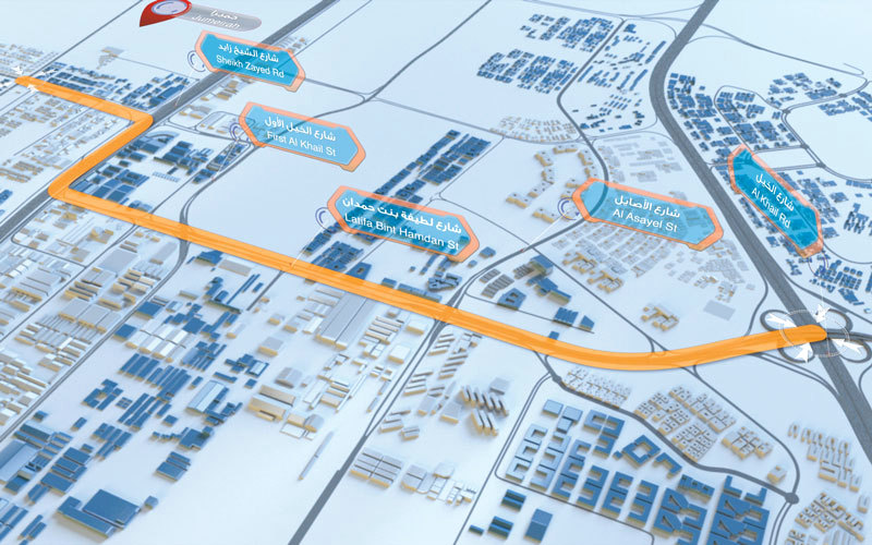 وأضاف أن «العقد الأول من المشروع يتضمن تطوير شارعي لطيفة بنت حمدان وأم الشيف، من تقاطع الصفا (التقاطع الثاني) إلى تقاطع المنارة على شارع الشيخ زايد (التقاطع الثالث)، بحيث يتضمن المشروع ربط منطقة جميرا بشارع الخيل والطرق الموازية (شارعي الخيل الأول والأصايل)، من خلال تنفيذ طرق وجسور بمستويين، توفر حركة مرورية حرة من شارع أم الشيف باتجاه شارع الوصل وشارع الشيخ زايد، وصولاً إلى شارع لطيفة بنت حمدان، وكذا من شارع الزمرد شرقاً إلى شارع الشيخ زايد، وسيتم ربط الجسرين بشارع الشيخ زايد عبر جسور توفر مخارج حرة للحركة المرورية».