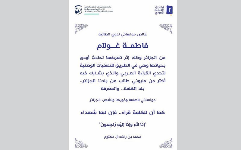 وقال صاحب السمو الشيخ محمد بن راشد آل مكتوم، عبر حساب سموه الرسمي بموقع التواصل الإجتماعي "تويتر"، خالص مواساتي لذوي الطالبة فاطمة غولام من الجزائر لوفاتها إثر تعرضها لحادث أودى بحياتها وهي في الطريق للتصفيات النهائية لتحدي القراءة العربي، والذي يشارك فيه أكثر من مليوني طالب من بلدنا الجزائر.. بلد الكلمة والمعرفة، مواساتي لأهلها وذويها ولشعب الجزائر، كما أن للكلمة قراء.. فإن لها شهداء..