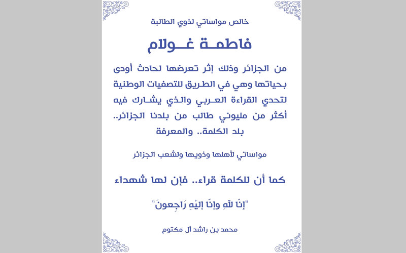 توجّه صاحب السمو الشيخ محمد بن راشد آل مكتوم، نائب رئيس الدولة رئيس مجلس الوزراء حاكم دبي، بالتعازي والمواساة لذوي أهل الطالبة الجزائرية فاطمة غولام، ولشعب الجزائر الشقيق، في وفاة فاطمة، إثر تعرضها لحادث أثناء قطعها نحو 1500 كيلومتر (18 ساعة بالسيارة) للوصول إلى العاصمة الجزائر، والمشاركة في التصفيات الوطنية لتحدي القراءة العربي على مستوى الجزائر.