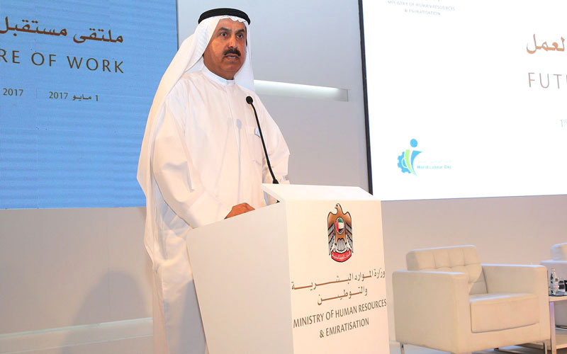 وقال وزير الموارد البشرية والتوطين، صقر غباش، خلال الملتقى الذي انعقد، أول من أمس، في دبي، ضمن احتفالات الوزارة باليوم العالمي للعمال، الذي يوافق الأول من مايو في كل عام، إن الملتقى ينعقد في ظل تزايد اهتمام المعنيين بشؤون العمل، من مؤسسات ومتخصصين وباحثين، بالتغير المطرد في عالم العمل، ويرى بعض الباحثين المختصّين أن عالم العمل سيتأثر سلباً بفعل هذه المتغيرات، سواء من حيث قدرة أسواق العمل على إعادة إنتاج فرص وأنماط عمل تقليدية، وما سيؤول إليه اضمحلال العديد منها من اختلال في التوازن بين الطلب والعرض، أو على الأقل من تفاقم فوارق الأجور وما يترتب على ذلك من تقلّص فرص العمل اللائق والعدالة الاجتماعية.