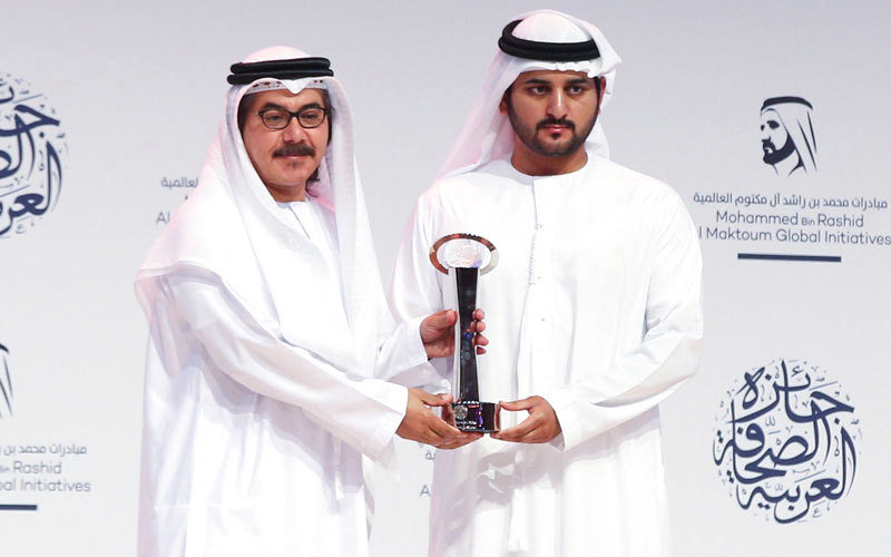 وسلّم سموه جائزة «العمود الصحافي» إلى الكاتب والإعلامي الإماراتي، ناصر الظاهري، كاتب العمود اليومي في صحيفة الاتحاد بعنوان «العمود الثامن».
