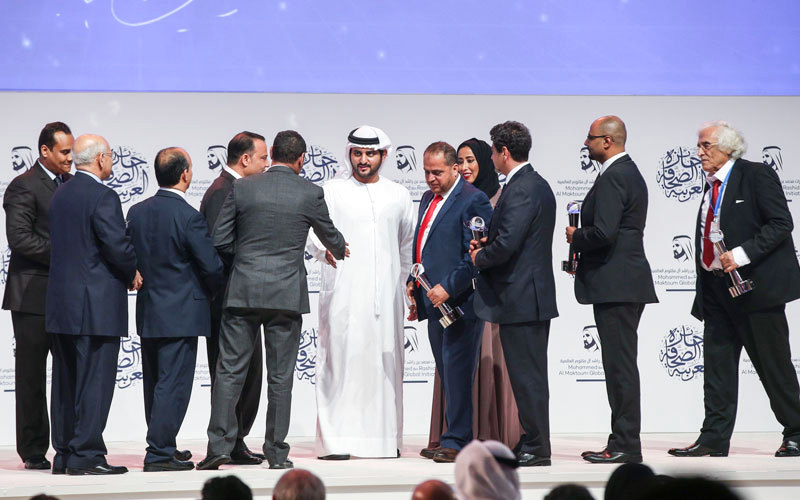 كرّم سمو الشيخ مكتوم بن محمد بن راشد آل مكتوم، نائب حاكم دبي رئيس مجلس إدارة مؤسسة دبي للإعلام، أمس، 17 فائزاً بـ«جائزة الصحافة العربية» لعام 2017، تزامناً مع ختام الدورة الـ16 لـ«منتدى الإعلام العربي».