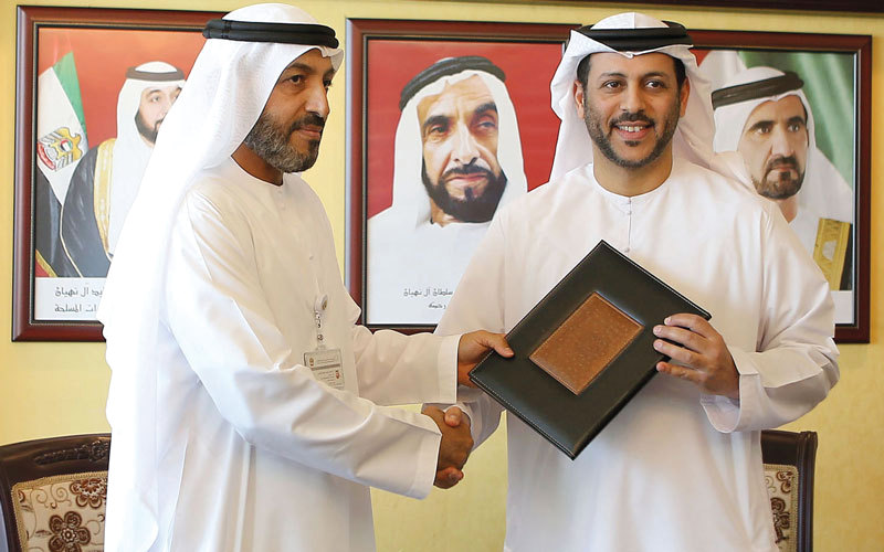 بن حيدر (يمين) والكعبي وقّعا مذكرة تفاهم على طباعة المصحف الشريف. تصوير: إريك أرازاس