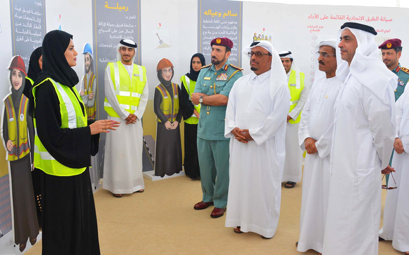 سيف بن زايد يستمع لشرح حول مبادرات السلامة المرورية. من المصدر