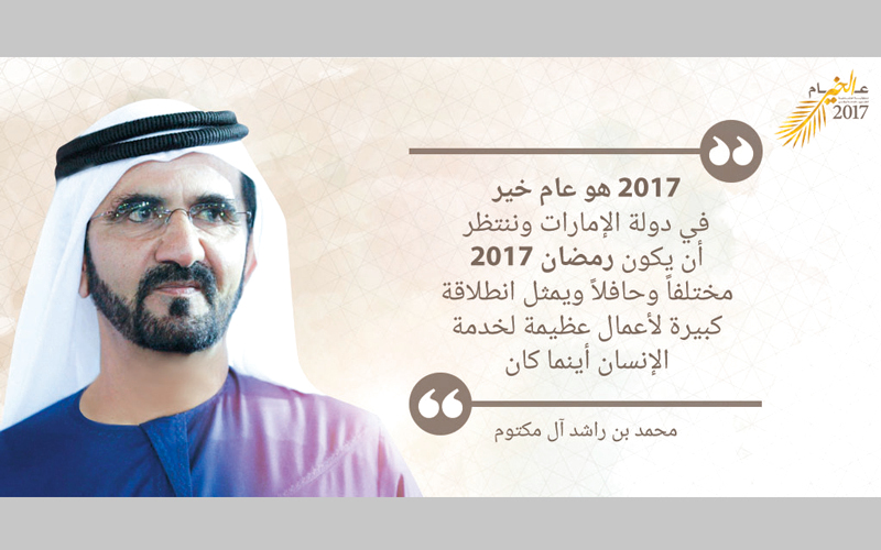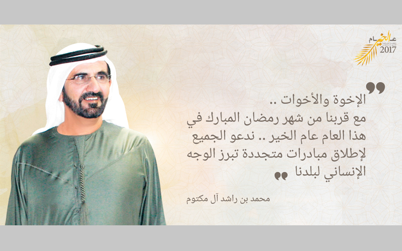 أكّد صاحب السمو الشيخ محمد بن راشد آل مكتوم، نائب رئيس الدولة رئيس مجلس الوزراء حاكم دبي، أن «عام الخير مناسبة لإبراز الوجه الإنساني لشعب الإمارات، وشهر رمضان فرصة كبرى لترسيخ ذلك».