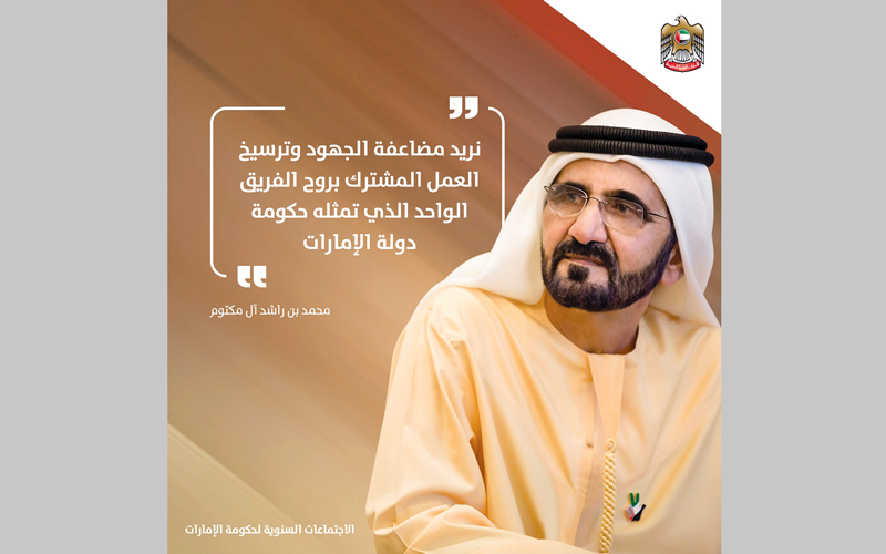 اعتمد مجلس الوزراء عقد تجمع وطني سنوي تحت مسمى «الاجتماعات السنوية لحكومة الإمارات»، برئاسة صاحب السمو الشيخ محمد بن راشد آل مكتوم، نائب رئيس الدولة رئيس مجلس الوزراء حاكم دبي، وحضور الحكومات المحلية كافة ممثلة في مجالسها التنفيذية، وبمباركة من صاحب السمو الشيخ محمد بن زايد آل نهيان، ولي عهد أبوظبي نائب القائد الأعلى للقوات المسلحة، وذلك في مشروع وطني جديد يهدف لجمع الجهات الاتحادية والمحلية كافة والفعاليات الوطنية لمناقشة التحديات التنموية الحالية ووضع تصور تنموي للمستقبل.