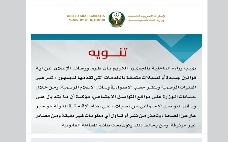 نفت وزارة الداخلية ما تم تداوله على وسائل التواصل الاجتماعي عن تعديلات على نظام الإقامة في الدولة وتؤكد أنه خبر عار عن الصحة، وتهيب بالجمهور بأن طرق وسائل الإعلان عن أي قوانين جديدة أو تعديلات متعلقة بالخدمات التي تقدمها تمر عبر القنوات الرسمية وتنشر حسب الأصول في وسائل الاعلام، وتحذر من نشر أو تداول معلومات غير دقيقة، ومن يخالف ذلك يكون تحت المساءلة القانونية.