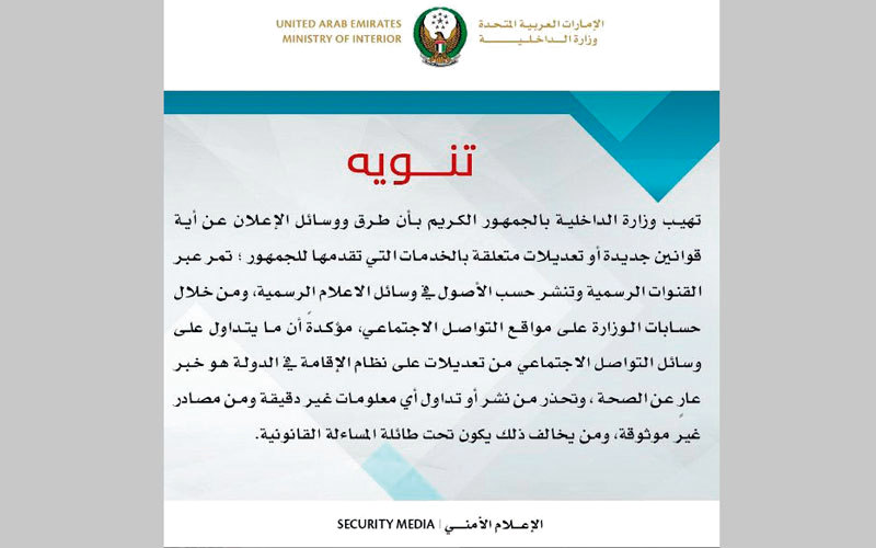 وأهابت وزارة الداخلية بالجمهور بأن طرق وسائل الإعلان عن أي قوانين جديدة أو تعديلات متعلقة بالخدمات التي تقدمها تمر عبر القنوات الرسمية وتنشر حسب الأصول في وسائل الاعلام الرسمية.