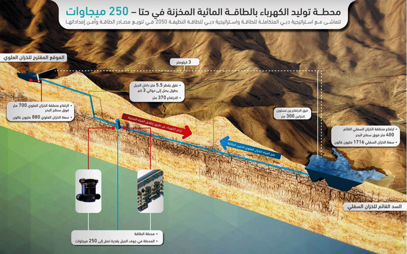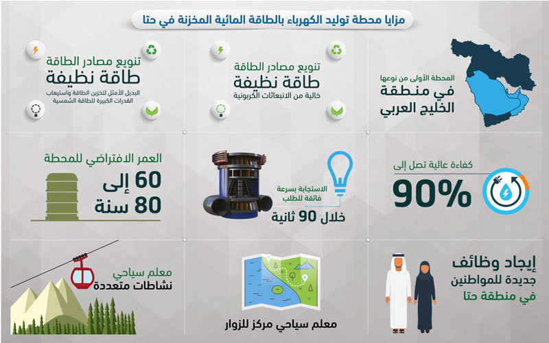 وتعد المحطة الكهرومائية لتوليد الكهرباء بالاستفادة من المياه المخزنة في سد حتا، الأولى من نوعها في منطقة الخليج العربي، بقدرة إنتاجية تصل إلى 250 ميغاواط، وبعمر افتراضي يراوح بين 60 و80 عاماً.
