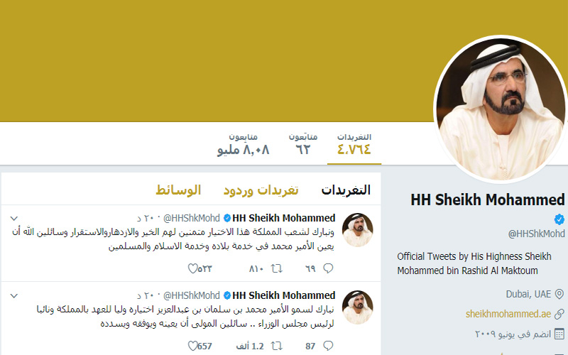 هنأ صاحب السمو الشيخ محمد بن راشد آل مكتوم، نائب رئيس الدولة رئيس مجلس الوزراء حاكم دبي، سمو الأمير محمد بن سلمان بن عبدالعزيز لاختياره وليا للعهد ونائبا لرئيس مجلس الوزراء بالمملكة العربية السعودية.